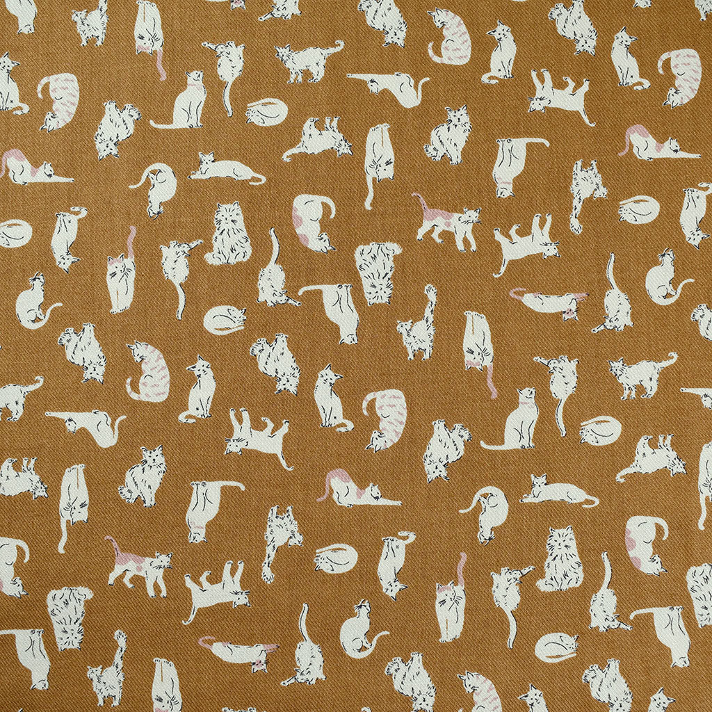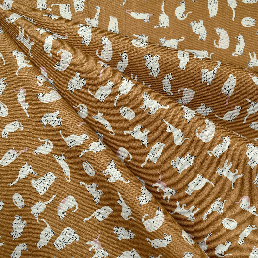 Japanese Tiny Prowling Cats Fine Twill Shirting Ochre