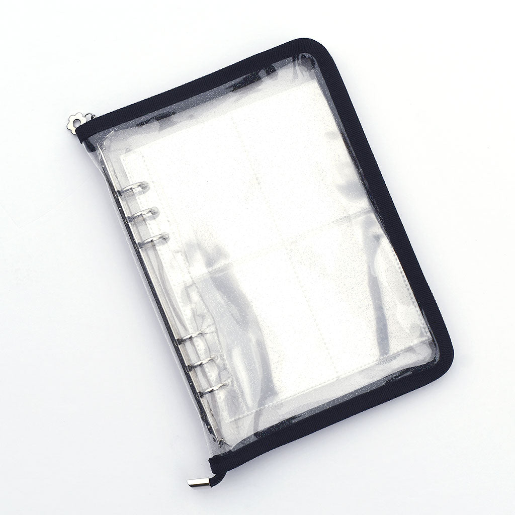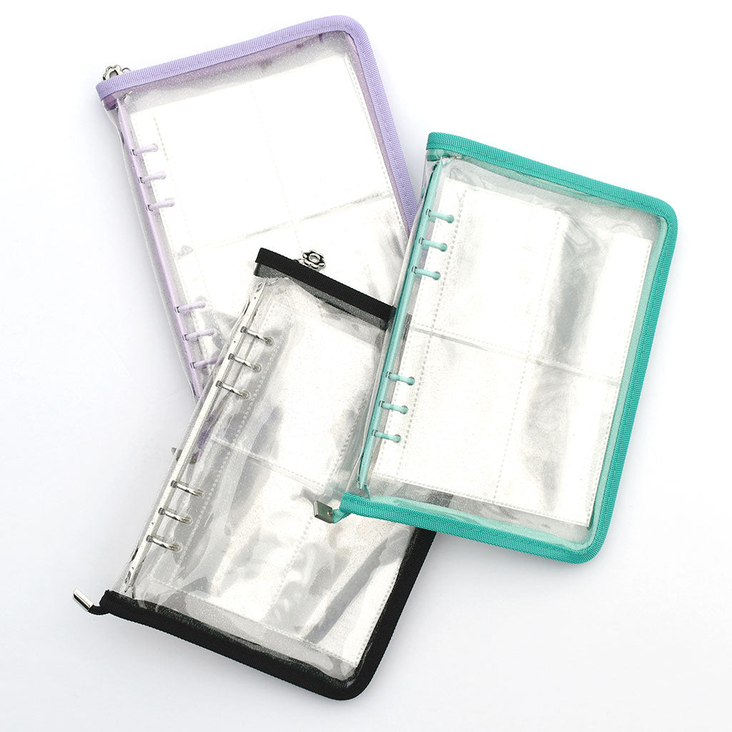 Each organizer measures roughly 7" x 10" and includes (5) pages each with four pockets on each side (40 pockets total). The front and back covers are clear sparkly vinyl and the zipper has an adorable flower charm for easy opening and closing. Choose the color that fits you best!