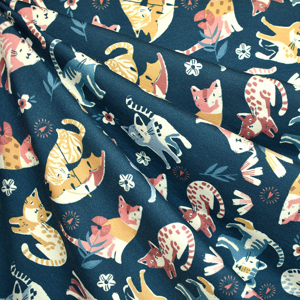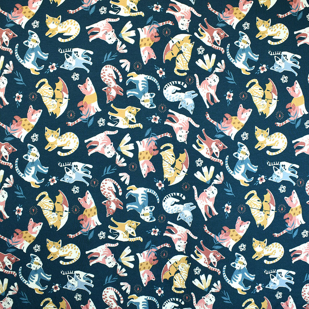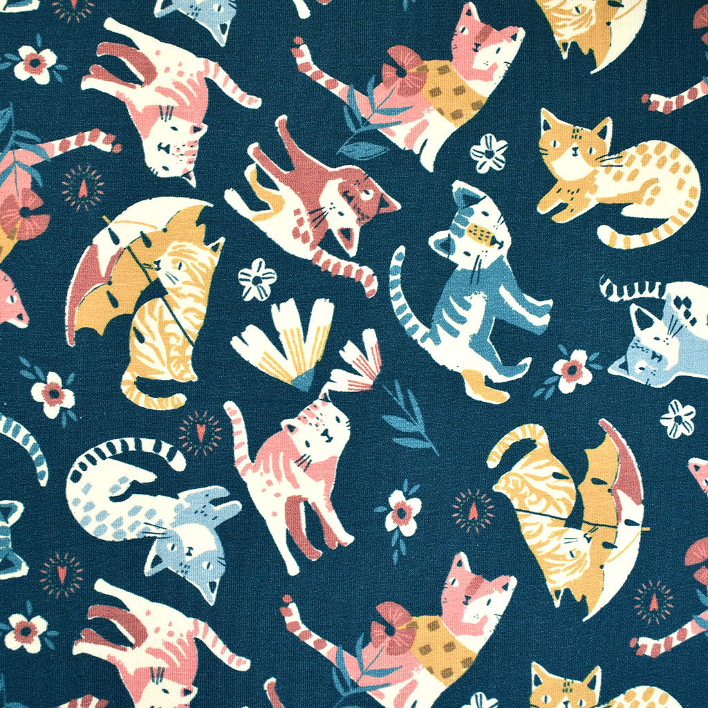 Rainy Day Cats Cotton Jersey Knit Ocean/Multi